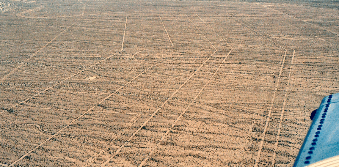 From altitude, the Mojave looks empty—until the ground resolves into intent. You see faint grids, scarred tracks, and ghost-camps drawn like pencil lines across the sand. Those aren’t random marks. They are the physical residue of a decision that changed how America learned to fight.