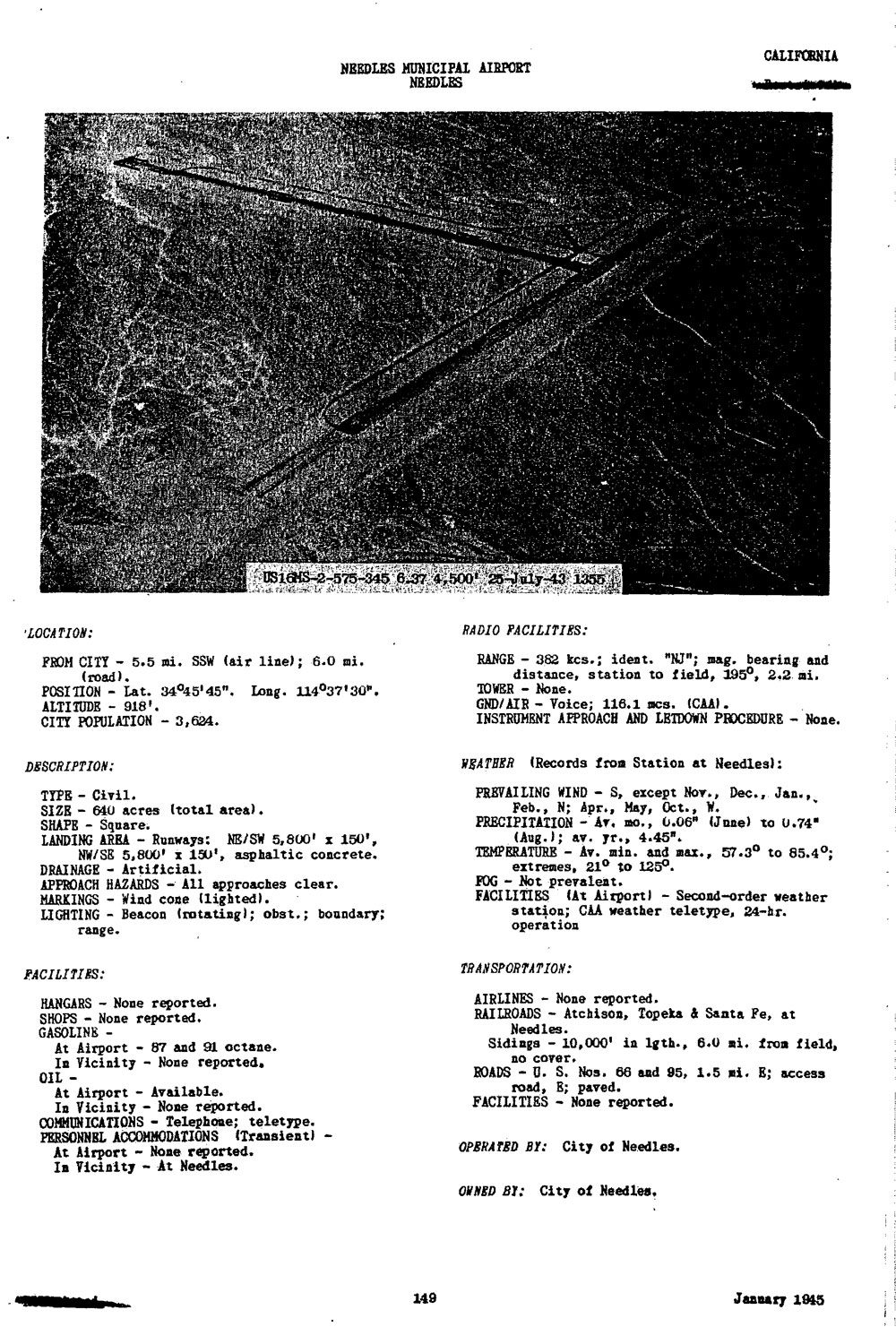 Located 5.5 miles south of Needles, this airport was used by the Army to support training throughout the California-Arizona Maneuver Area and also served as an auxiliary field for March Field. It had been returned to civil operations by January 1945 and survives today as Needles Municipal Airport.