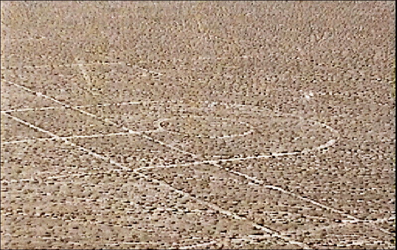 Your flight now turns northwest following the railroad tracks and Cadiz Road for over 40 miles to the remains of a small camp at Cadiz RR siding. As you approach from the south, you will see two light colored natural gas tanks and several large, dark square vineyards to the west of the road and tracks. Just north of this point is where the railroad tracks join an east/west track. North of the railroad tracks you will find the remains of the camp at Cadiz. It consists of one rock-lined road oriented east-west, and a rectangular rock alignment adjacent to the south. You will also notice the numerous tank tracks remaining on the desert surface. From here, you may optionally choose to visit: